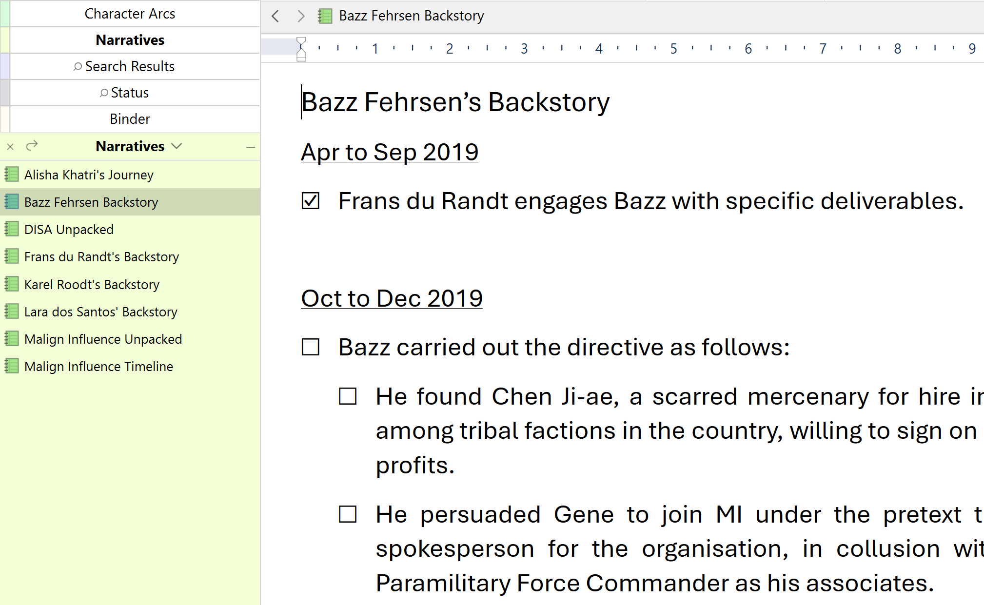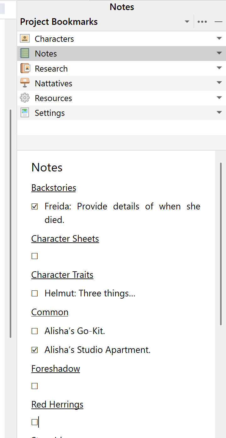 While I’m at it, I might as well link to some thoughts on the larger topic. There isn’t much new in there, from what I’ve skimmed of the above, save perhaps for some process-design-level remarks on the notion of collapsing legacy habits into a system that can take it. I.e. why use a separate spreadsheet to track your book data when you have a program like Scrivener that can embed all or most of that kind of data into its Outliner? Why maintain a discrete checklist oriented approach when the software can embed what we need to do right into the content itself and provide said checklists dynamically with its search features? Maybe there are good reasons, don’t get me wrong, but I think the question should be asked at the top: can I do this without building a formal to-do list tracker into the software? Can I get away with a collection looking for text markers or some other low-impact / high-reward system?