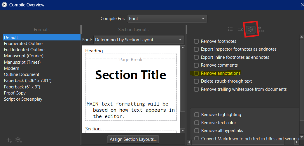 The problem is that in-line annotations disappear during compilation. That would be fine for a final version, where I wouldn’t want them, but not for a draft where I need to see the annotation.