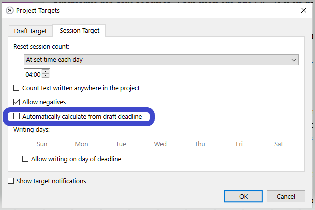 Quite suddenly, I can’t set a session target from the Project Targets menu. I’ve set a Draft target which I can amend but the button to amend the session target (words/characters) is greyed out. I wouldn’t have noticed except I was changing the target, accidentally changed to 259 words and now can’t amend it.