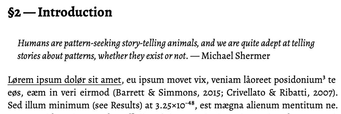 Read instructions and information sections in the binder, and look through the various compile formats. For the pandoc>typst compile format the Scrivener editor content shown above will give a PDF that looks like this: