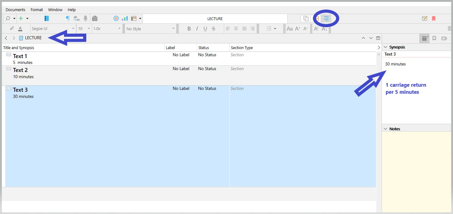 When I used Word to prepare my lectures, this was relatively easy to visualize, although not entirely accurate. Every one page or two for a question or joke, four or five pages before the break, etc. However, using Scrivener, I struggle to quickly gauge how much time I will spend on each topic, and the result is that I sometimes prepare more content than the students can actually grasp before disconnecting.