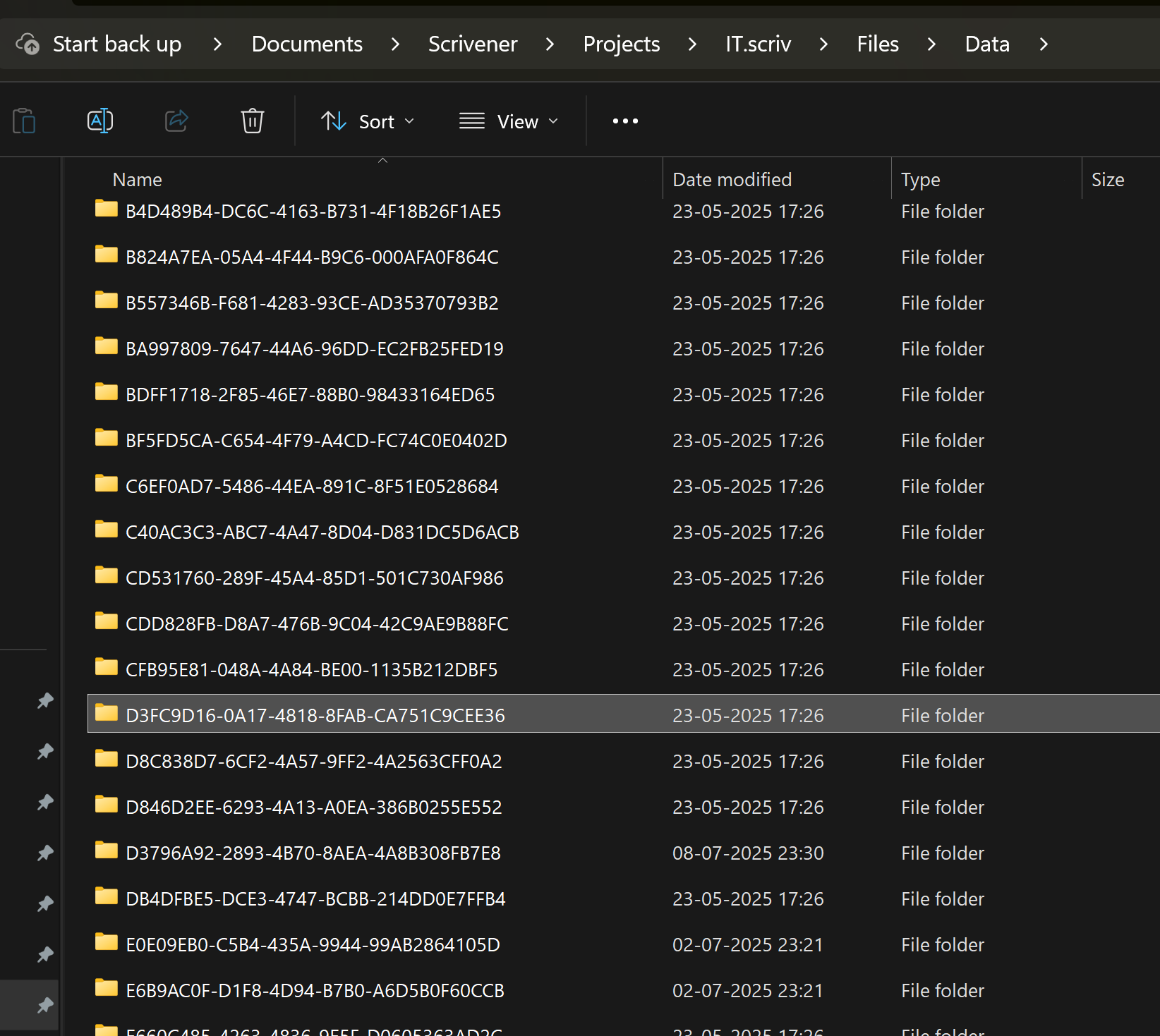 If you want a “key” to all of these internal IDs, you could locate the “search.indexes” file in the Data subfolder, copy that somewhere temporary and rename it to “Old Binder IDs.txt”, then import that into Scrivener. You can then search for binder titles, and relatively simply see which ID matches it.
