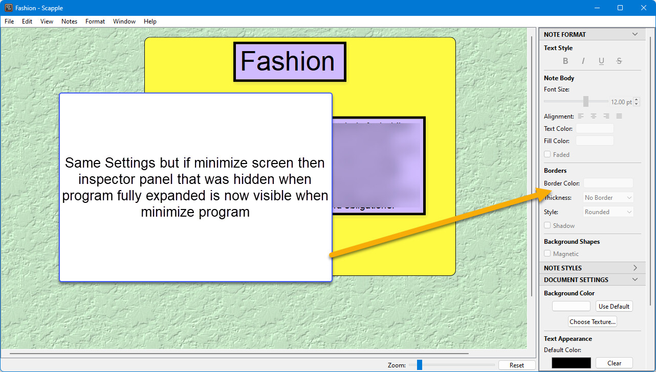 When fully open scapple file and click view inspector, see thin line at far right and sometimes can pull to view inspector panel and sometimes not. If unclick view inspector and then reclick will show up as a side panel OR if minimize window the invisible inspector panel can now be seen. Pics included.