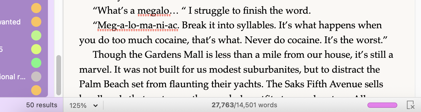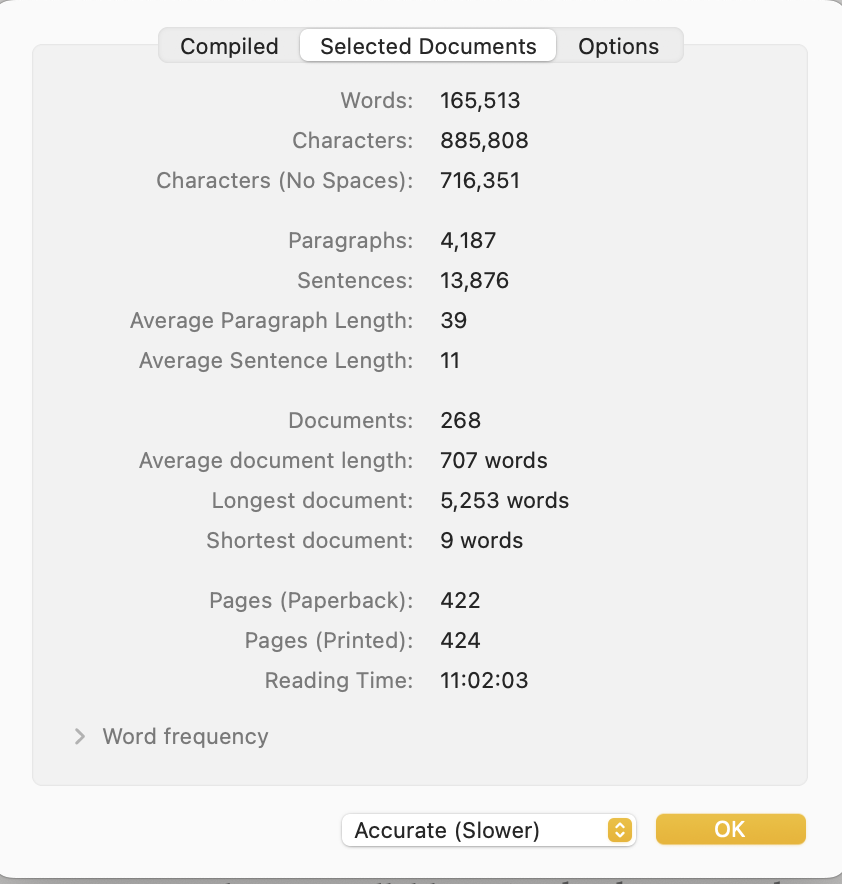It also means that the word count displayed at the bottom is perfectly cromulent so I will just rely on that in the future rather than going to statistics. I don’t love having to select all the docs in the MS, but doing that and glancing at the bottom of the screen doesn’t take more time than going to statistics.