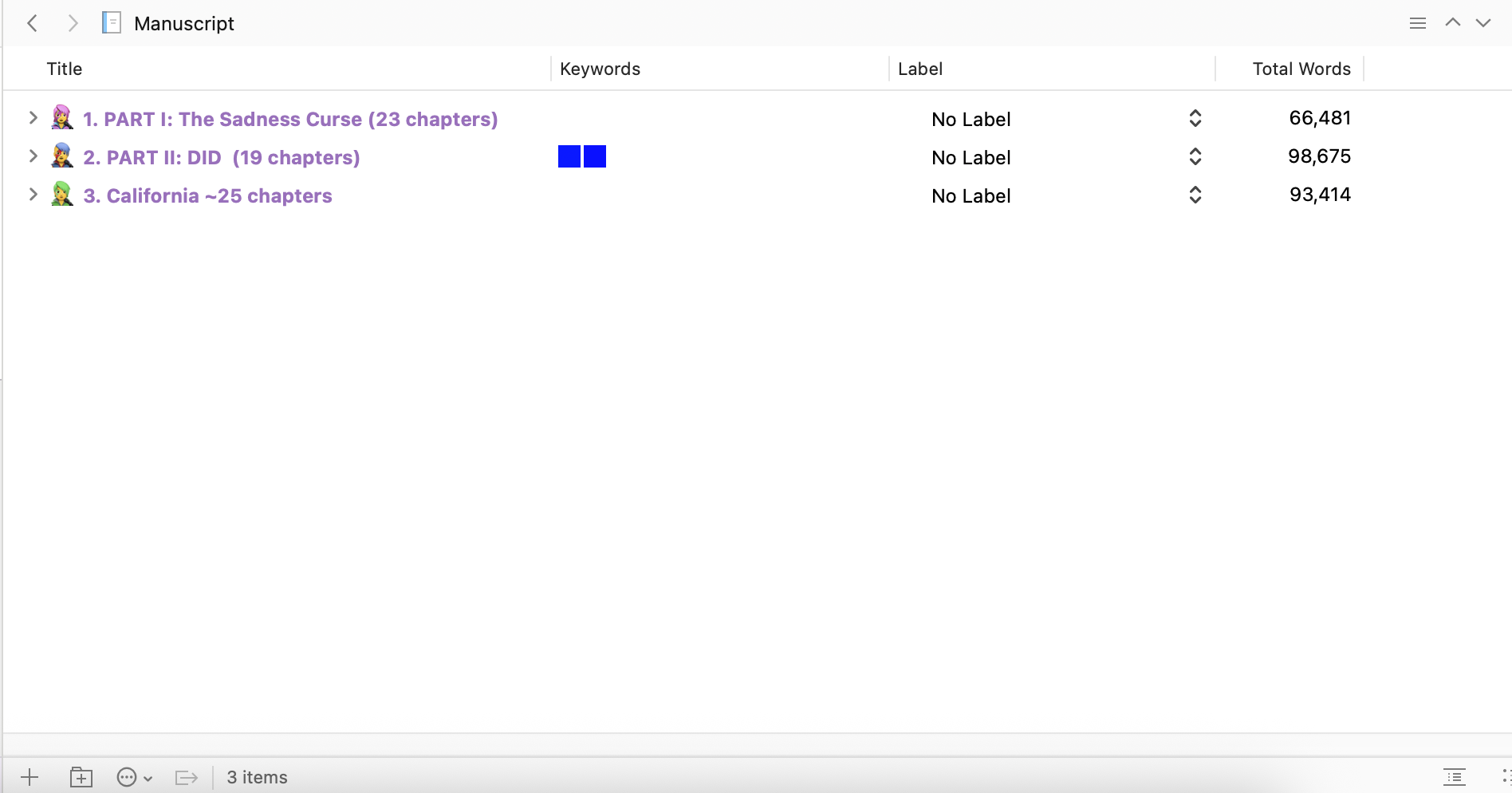 For example, my project is in three parts so when I minimize the folders as much as possible and am clicking on the top-most folder (manuscript) I don’t see total Totals. To see the grand total I’d need to add these three numbers together.