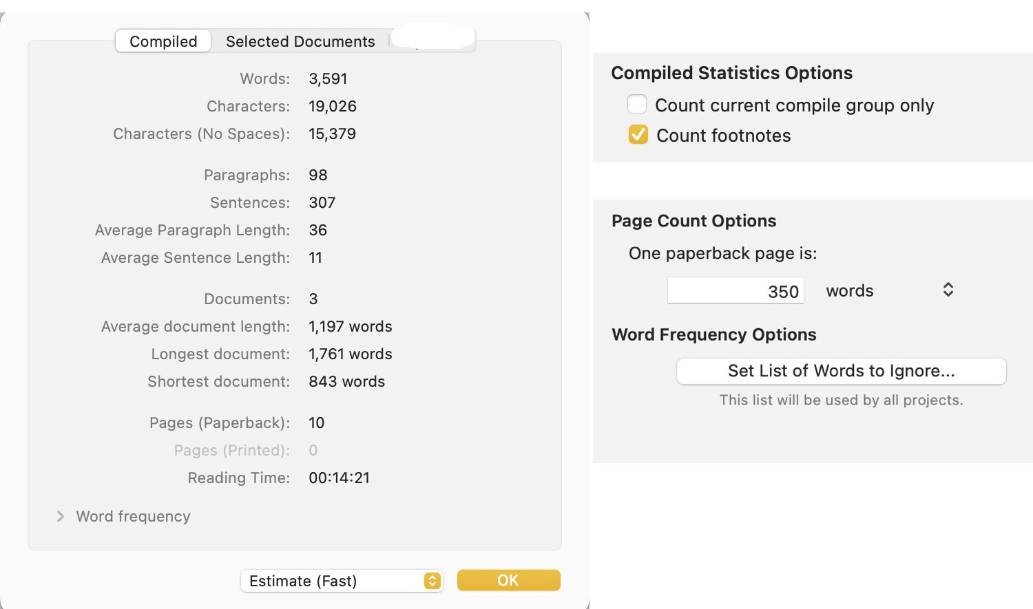 Yes, my point was that anyone like me who does this often is not going to ever be able to use the first section of Statistics to get the word count. Because it’s always going to show just a few scrivenings, that which is currently set to compile. So it made me feel like I must be doing something wrong, to have the Statistics primary tab always be so useless.