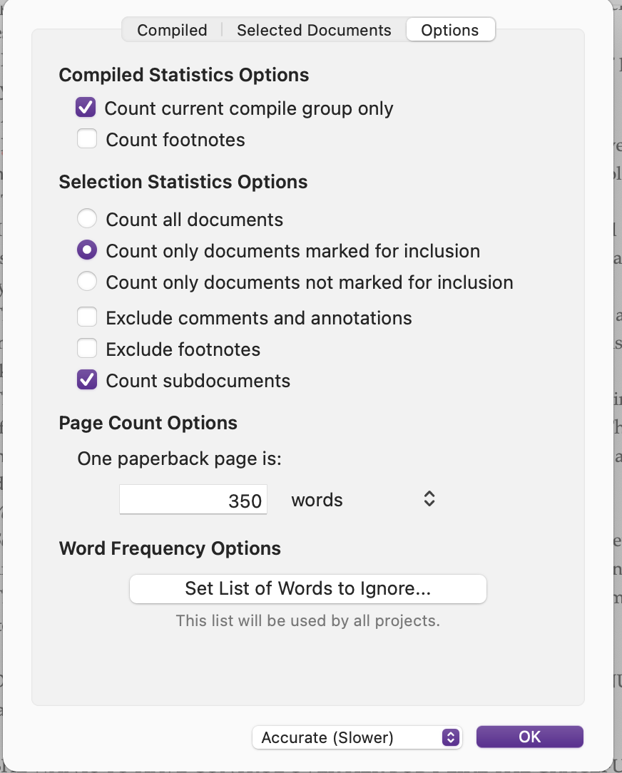 Hi - I love using Scrivener but one thing that I’ve found glitchy from the start is the word count. I just spent a good 15 minutes manually adding up my words for each chapter and also checked that each one was marked for compile and the word count is still a good 20k words off…word count is important to me and this is pretty frustrating. any advice? thx!
