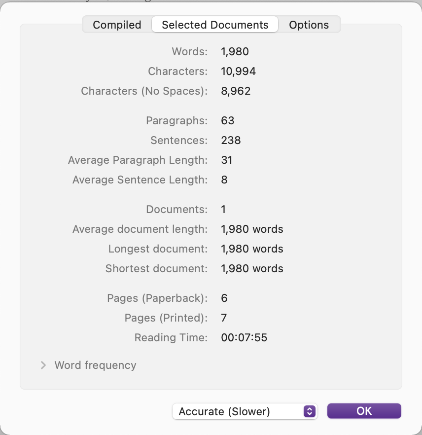 Hi - thank you both for your help. The settings in the “options choices” seem fine. I’ve been using ‘Show Project Targets’ to get my word count. It is still inaccurate: 49k vs 70k in the actual document. I checked the outline view and my math was correct and all documents seem to be checked for compile. Below are a few images but unless there is a quick and obvious solution I’m happy to just give up on ‘Show project targets’ and count using the outline going forward (I hadn’t thought to do that). Sometimes these things just take more time to figure out than they are worth!![]()