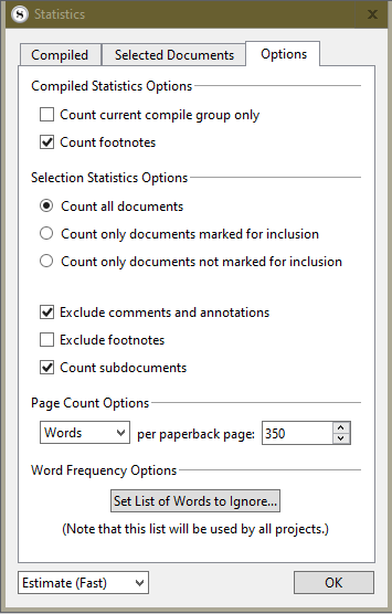 Celebration I just discovered the Word Frequencies option* at the bottom of the Project… Statistics dialog.