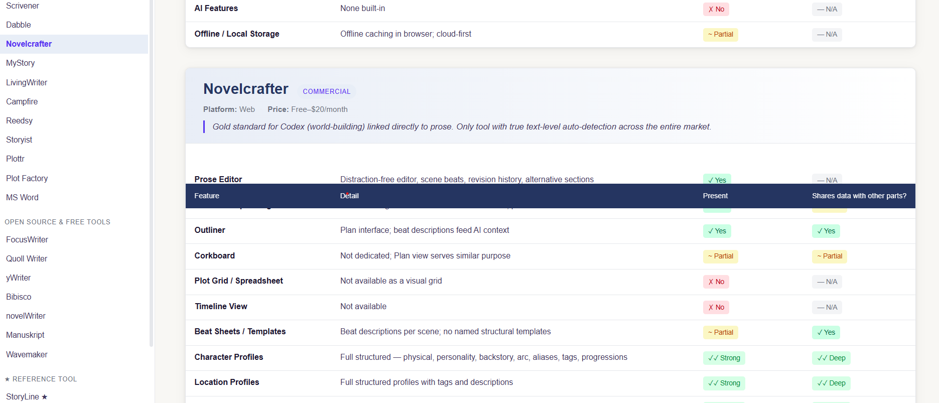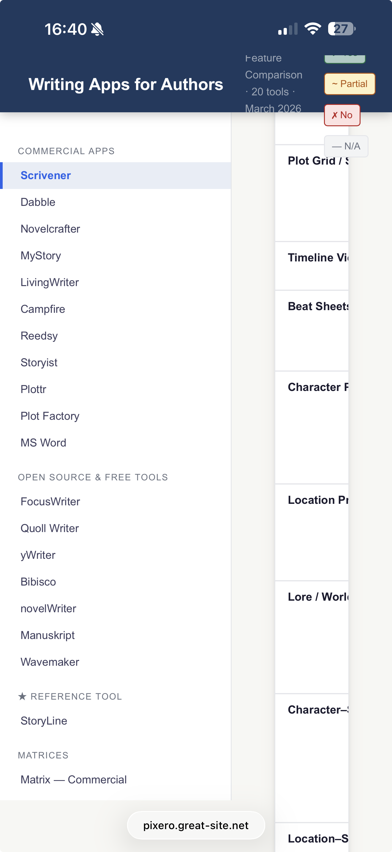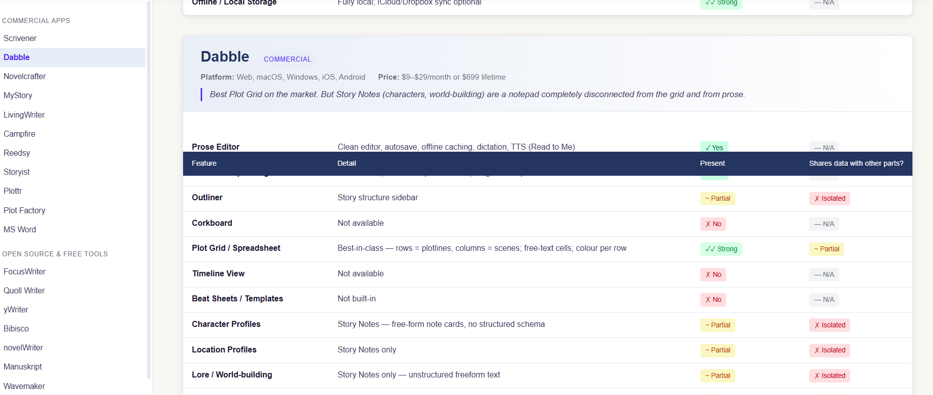 You have put a lot of work into the comparison. It is fair to say that different people have different requirements. Business people, lawyers, academics and students are often cited as the main user groups for mainstream âword processorsâ. Writing apps for fiction and non-fiction writers tend to be quite specialised. I think simplicity âthe feel of using an appâ its âlook and feelâ is a key attractor for some writers. It is not just an aesthetic consideration, the less there is to an app means that there is less to think about, less choices to make, and - usually with .txt files - simpler and faster sync between devices. (I spent years going virtually insane because of Wordâs terrible âStylingâ management, so simplicity for me means freedom from having that kind of hassle in my life.) I know that other people prefer having the bespoke features that some writing apps offer, building an index, inserting tables, footnotes, document navigation, and built-in structuring to help them get an overview of a complicated text. So, I think that the experience of using an app is really important. Itâs not just a technical checklist of features. I know this is self-evident, but it is often overlooked.