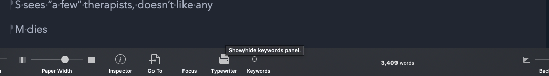 Below is a screenshot of Composition Mode. When I hover the mouse over the Typewriter, presumably for Typewriter Scrolling, I get the same screen tip as the one to the right, for Showing/Hiding Keyword Panel.