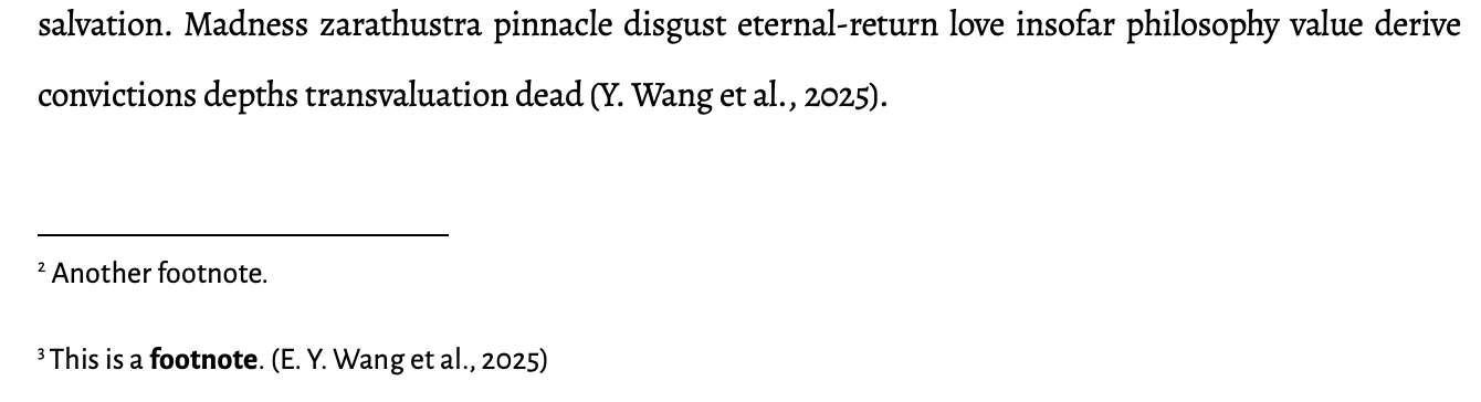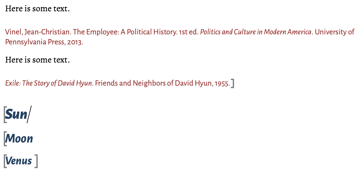 Don’t forget for pandoc you can just run pandoc in terminal without an input md file and paste input into the terminal to test the syntax easily (press ctrl+d to tell pandoc to process the pasted text). e.g. here is italicised text at the end of a fake citation: