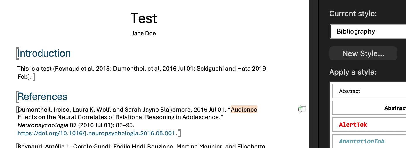 I’ve been slowly tailoring my docx Pandoc reference file and am running into issues with it recognize a “Bibliography” style. Typically I use live citations and Zotero to auto-generate a bibliography, however, it’s sometimes useful to incorporate static citations into my Scrivener documents (in addition to live citations).